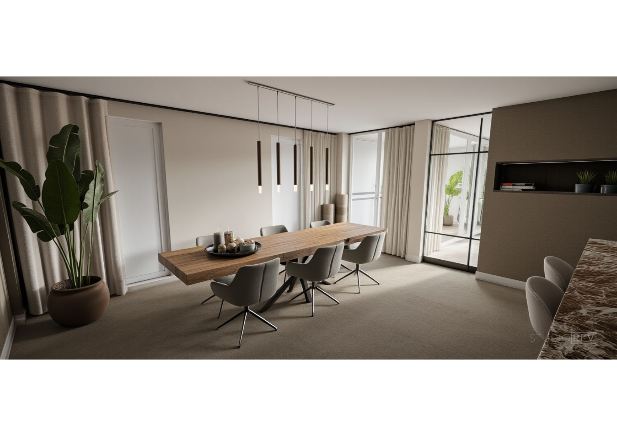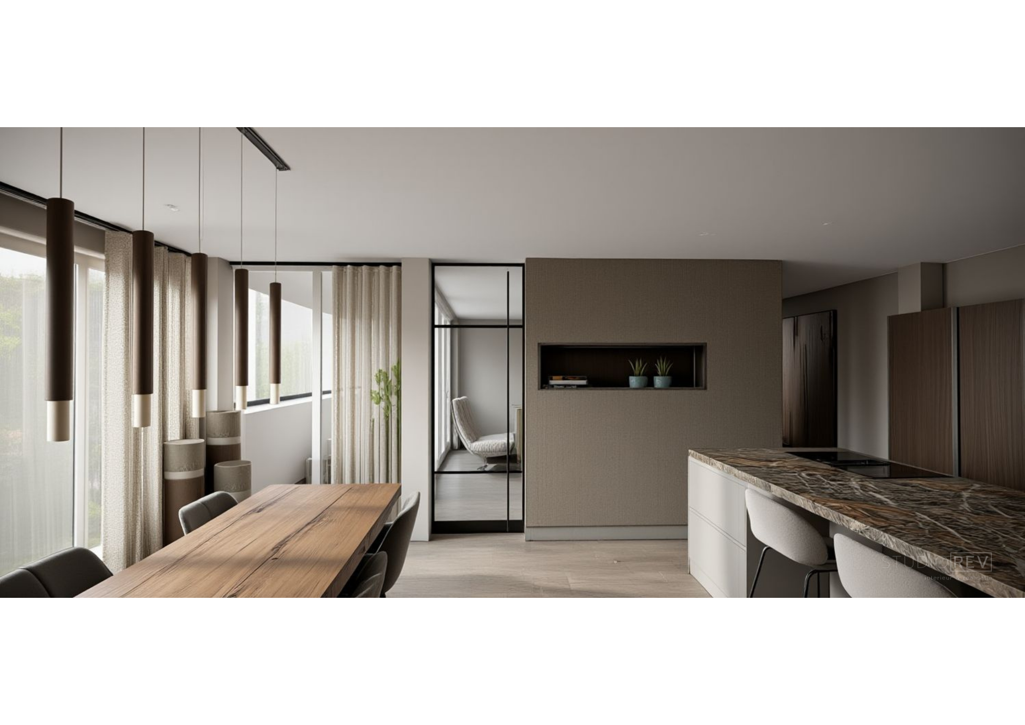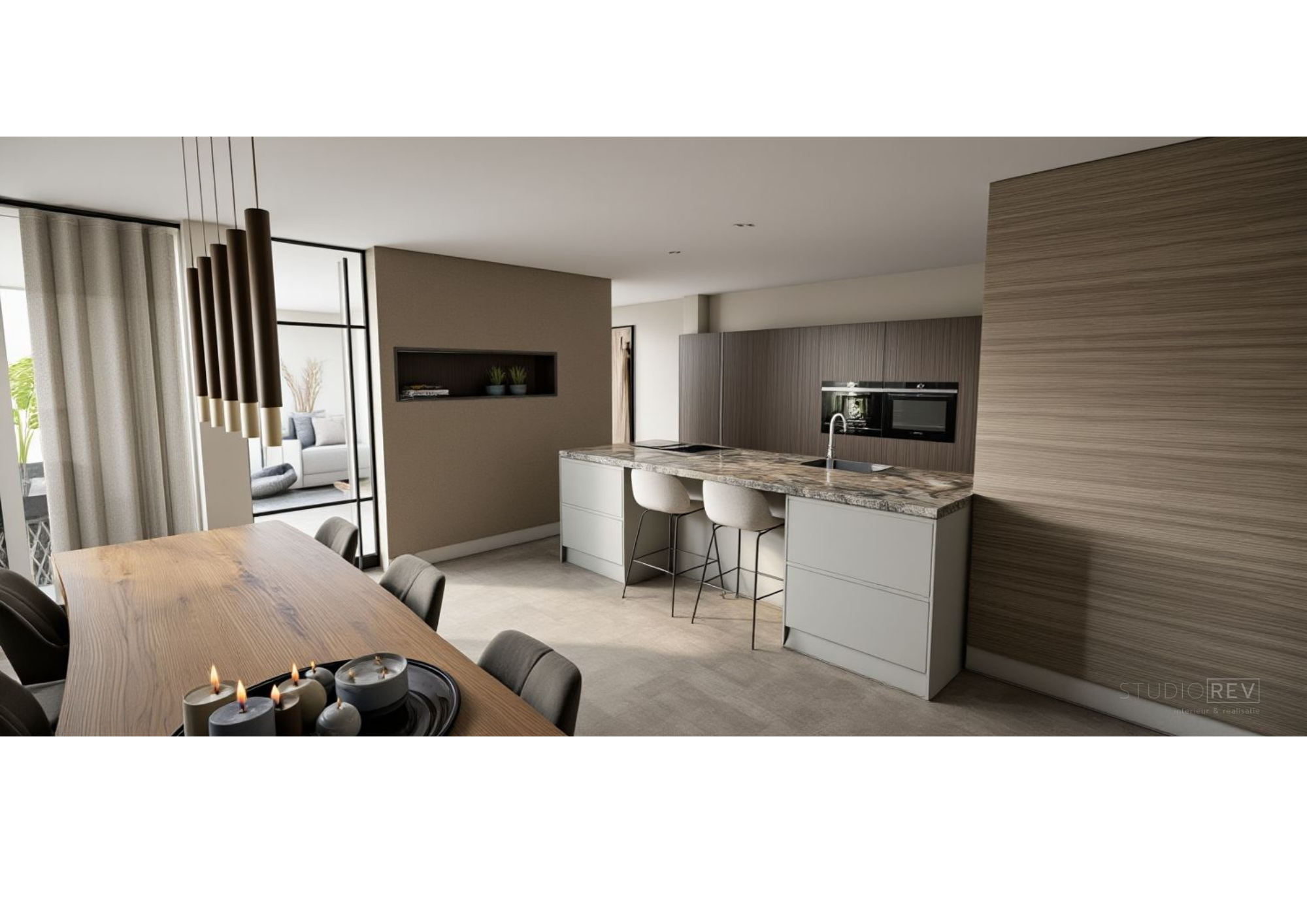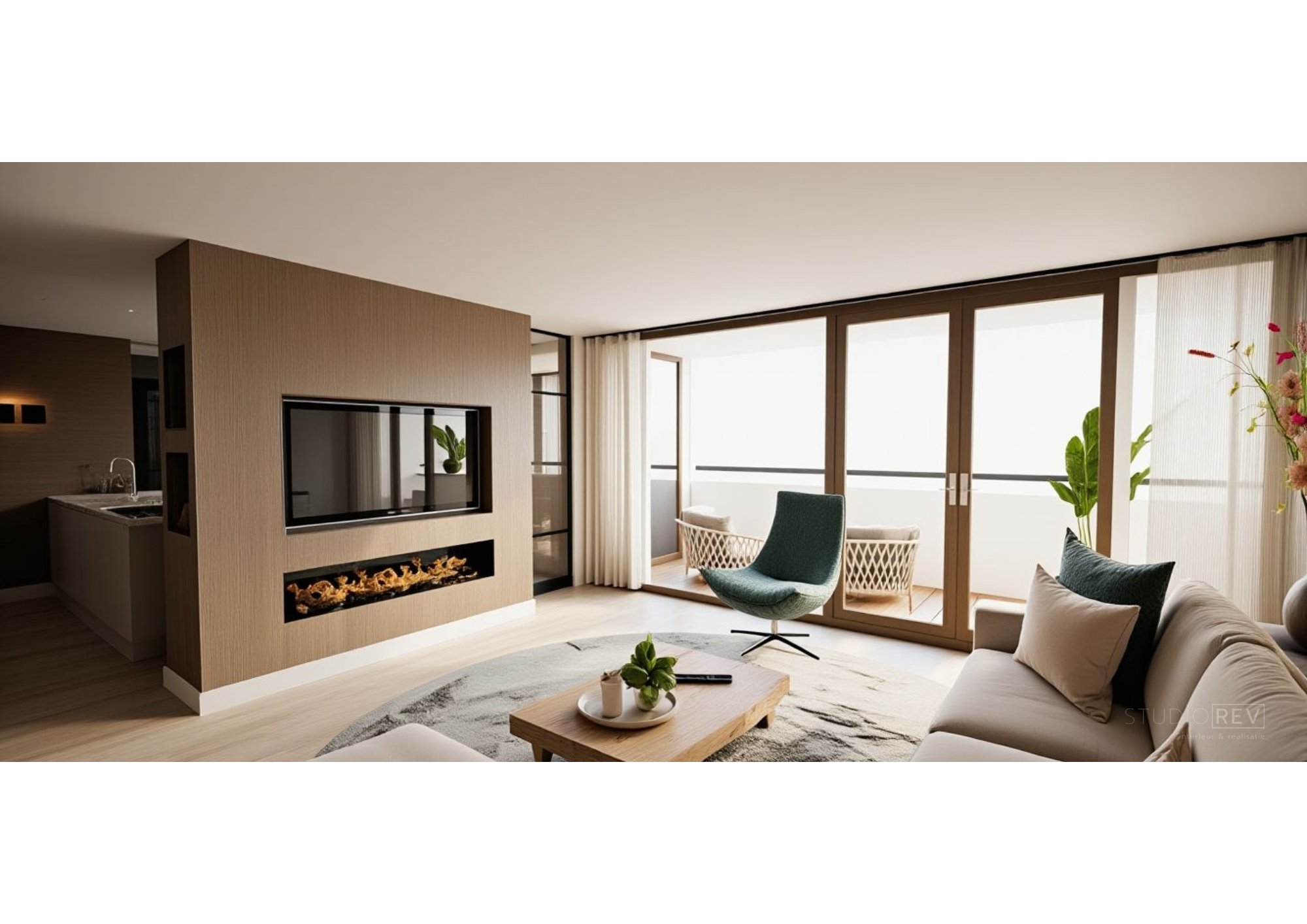 Van een royale vrijstaande woning naar een appartement: een flinke verandering. Toch voelden deze opdrachtgevers zich hier vanaf dag één thuis. Om het typische, standaard appartementengevoel te doorbreken, ontwierpen we een roomdivider tussen de keuken en het zitgedeelte. Hierdoor ontstonden twee duidelijk afzonderlijke ruimtes, terwijl de ruimtelijkheid behouden bleef. De roomdivider fungeert bovendien als cinewall en biedt plek voor persoonlijke accessoires. De haard vormt het warme middelpunt en maakt het geheel compleet. Door dezelfde vloer door het hele appartement toe te passen, ontstaat rust en samenhang. Grote vloerkleden in zowel de woonkamer als de slaapkamer voegen daar warmte en comfort aan toe.